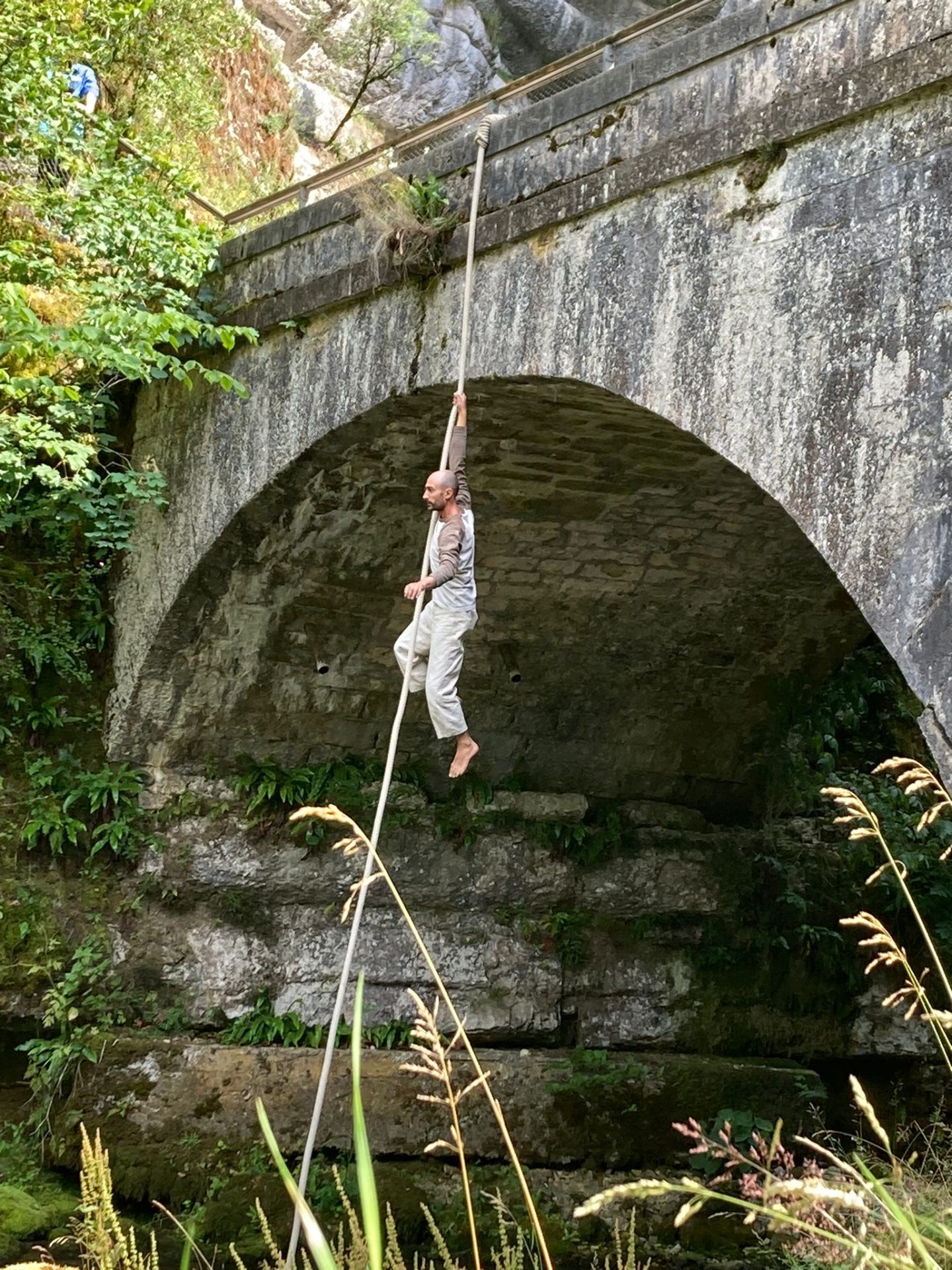 En l’air nous invite à suspendre notre souffle au gré des acrobaties d’Aedin et Julien, artistes aériens qui investissent ce somptueux site naturel de la source de la Loue.